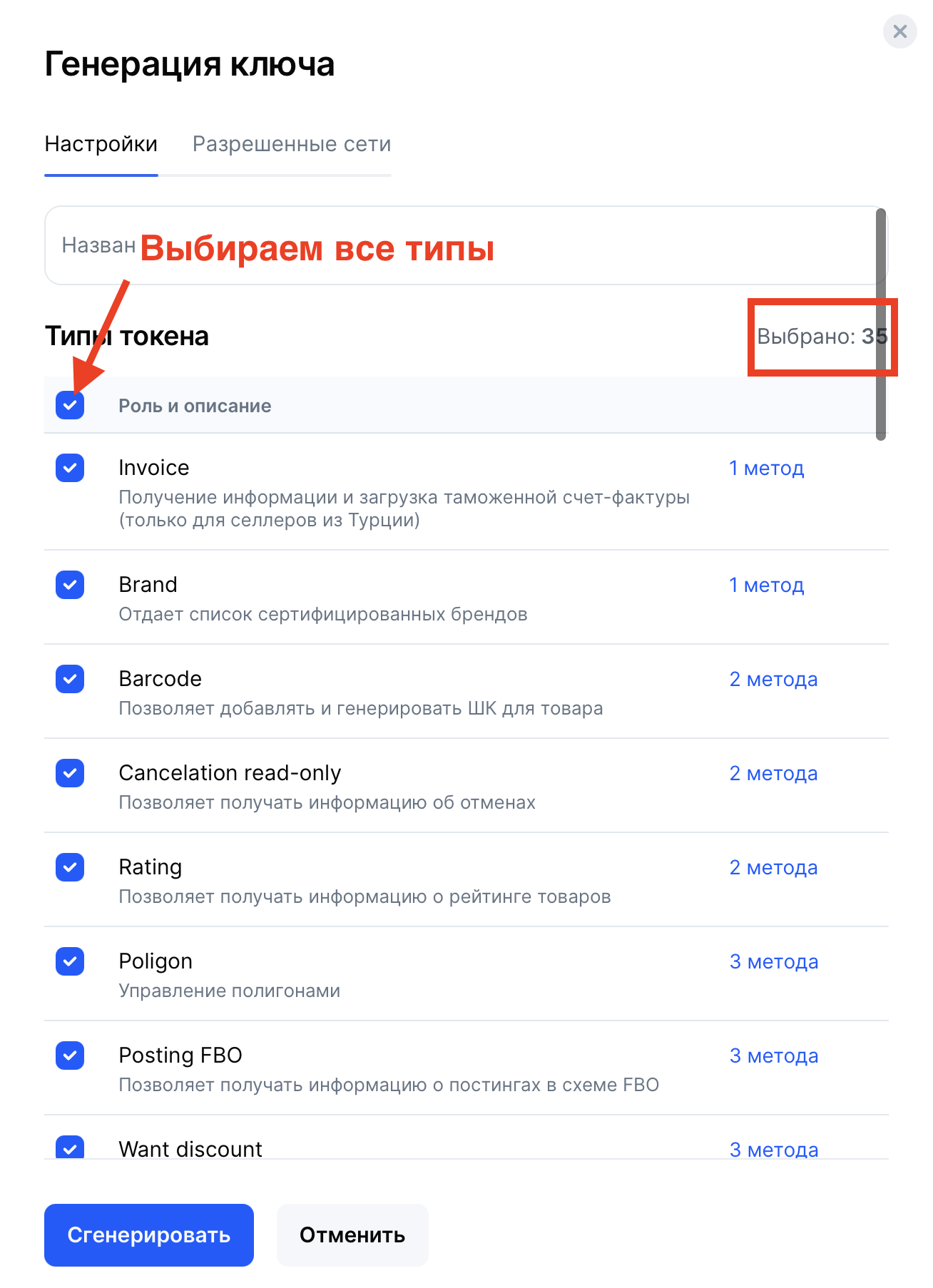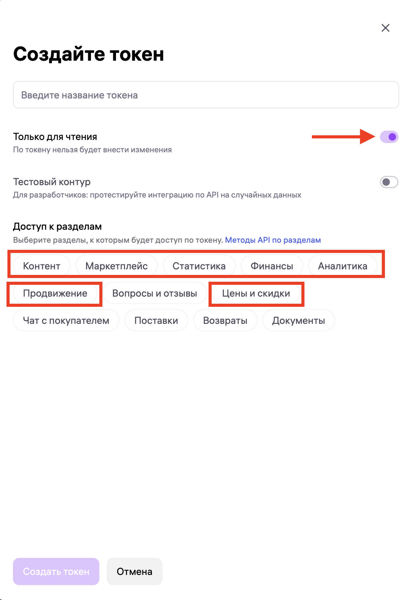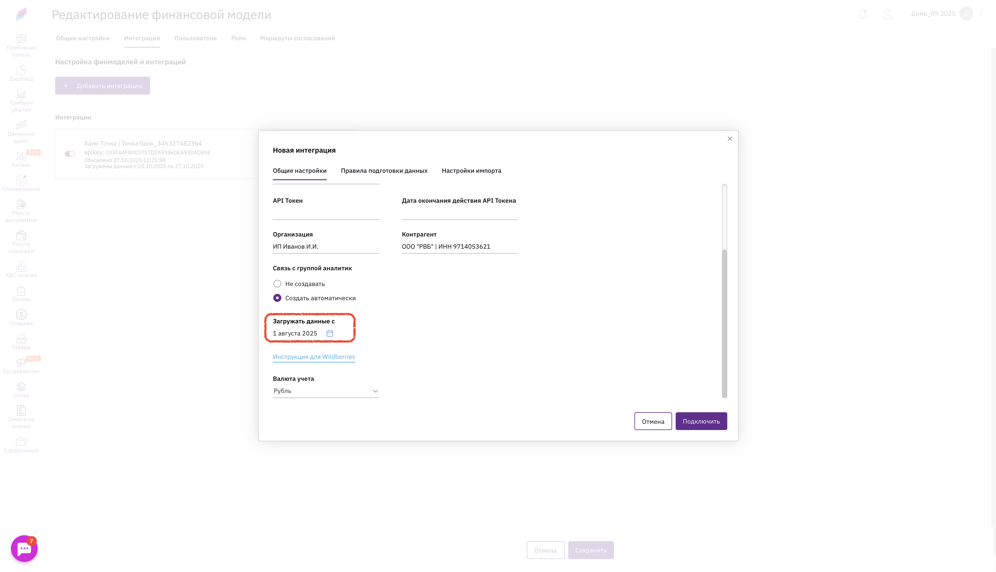 2. Вставьте сгенерированный ранее API ключ Wildberries (⚠️дата окончания ключа проставится автоматически)