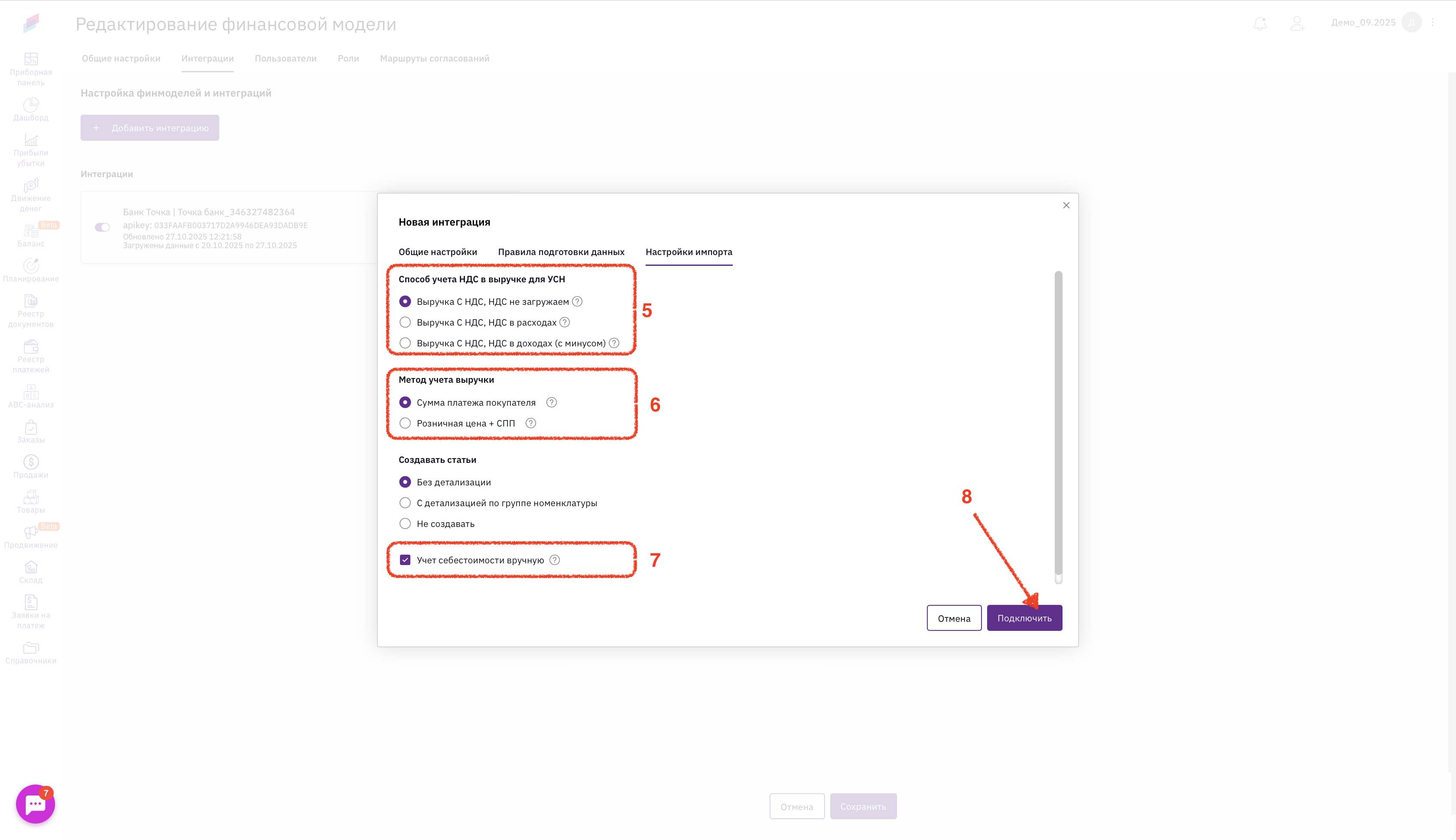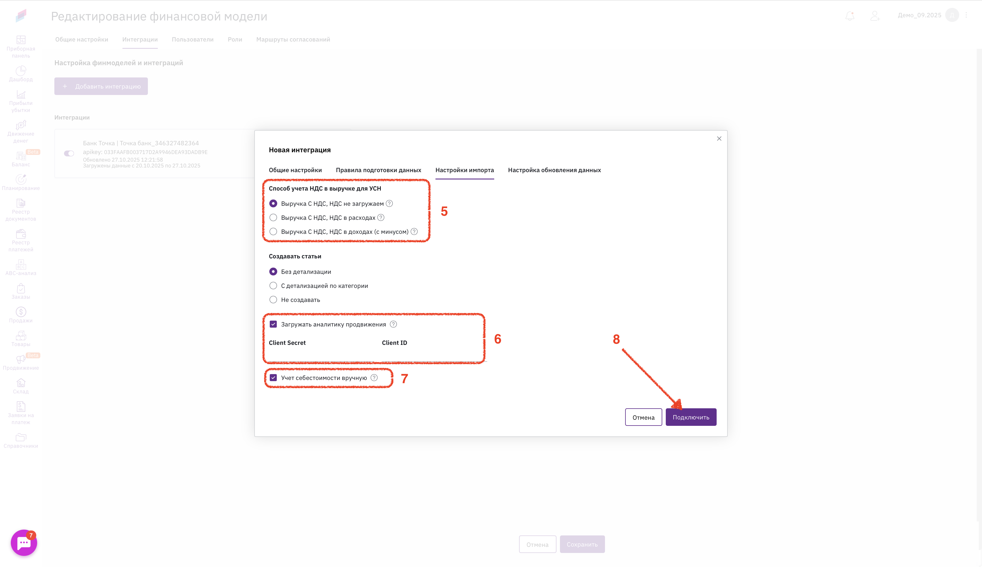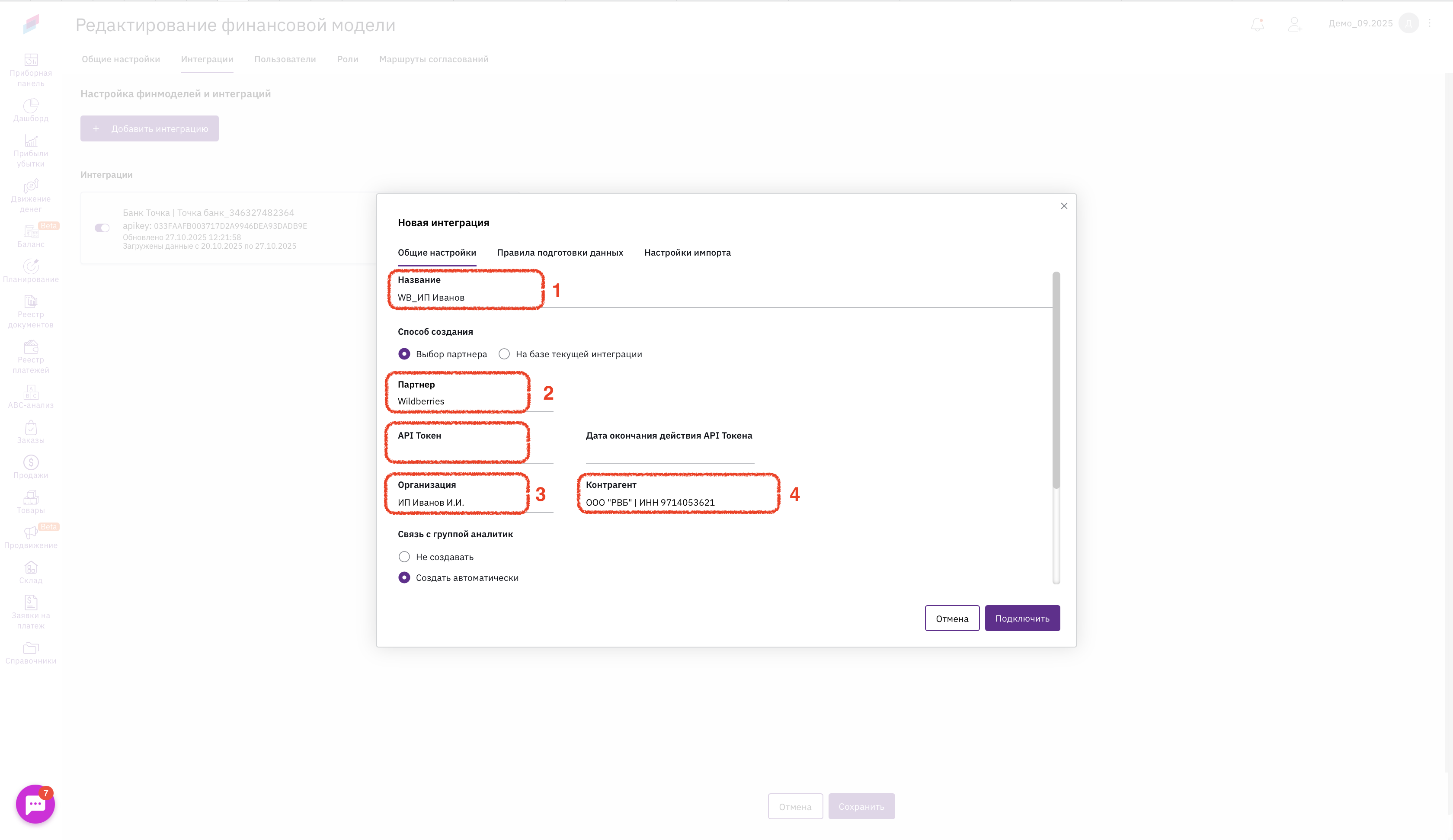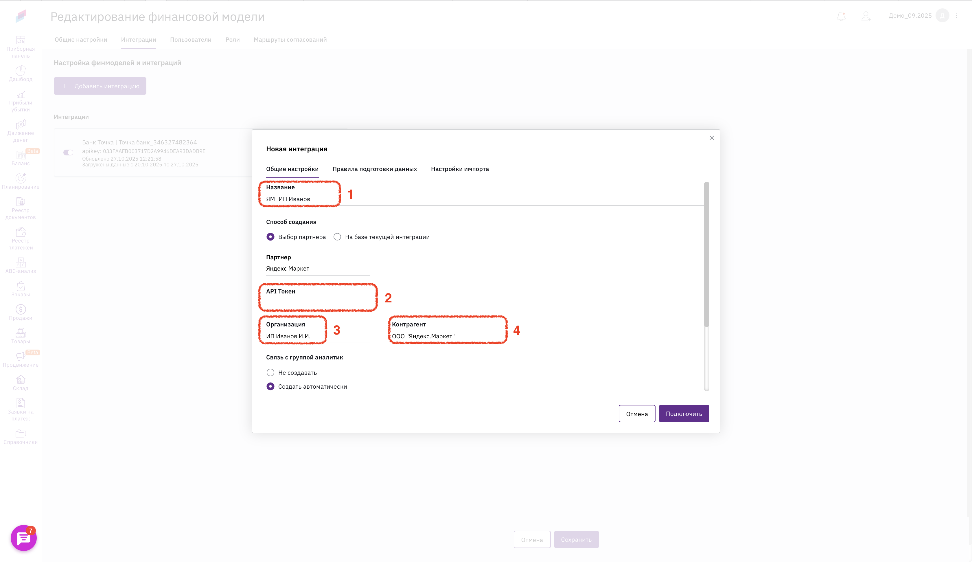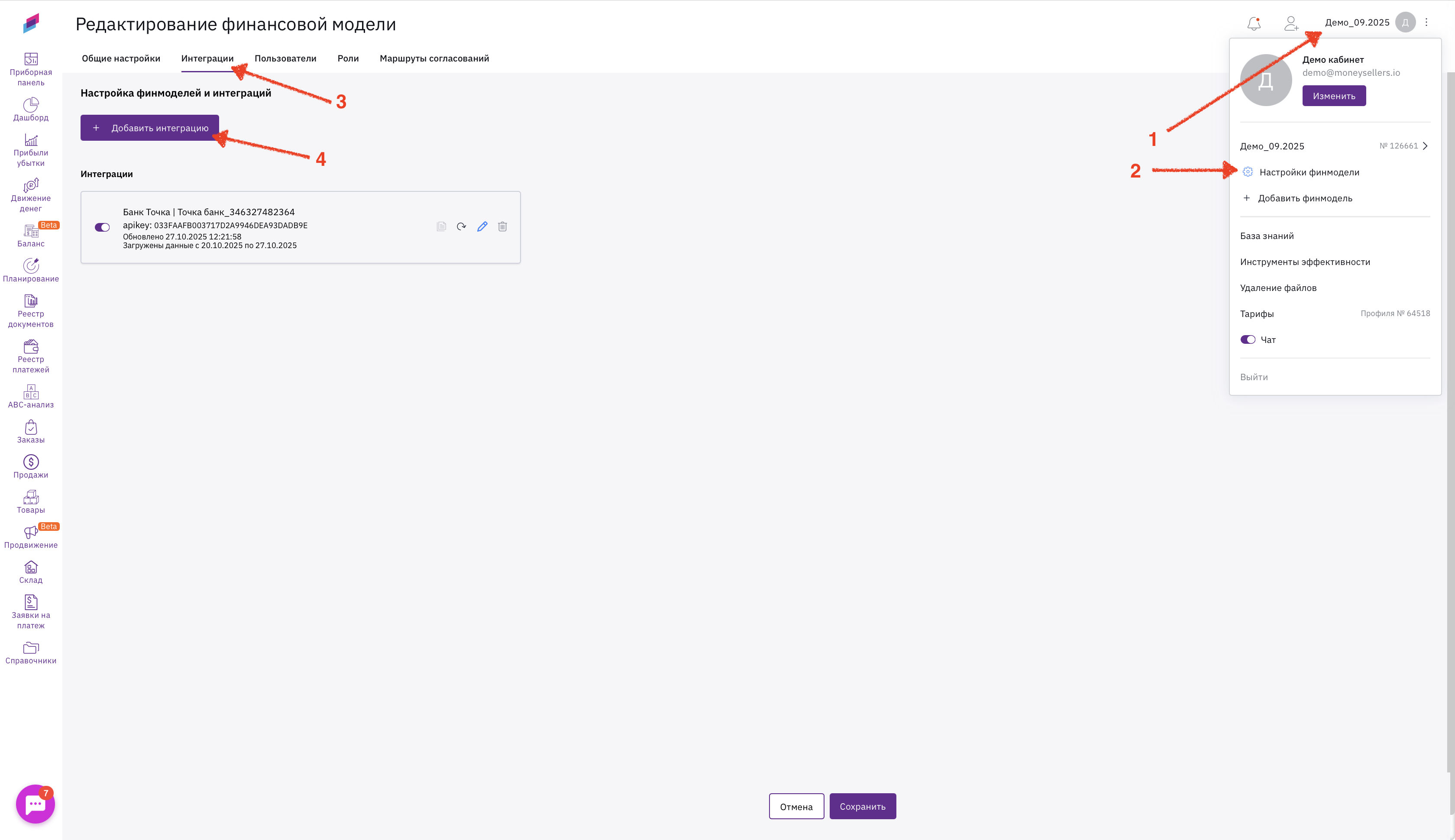 Для создания интеграции нажмите на Название финмодели (1) - Настройки финмодели (2) - Интеграции (3) - Добавить интеграцию (4)