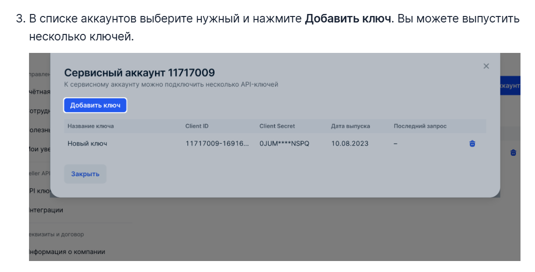 2. Вставьте сгенерированный ранее API ключ Ozon, а также Client ID