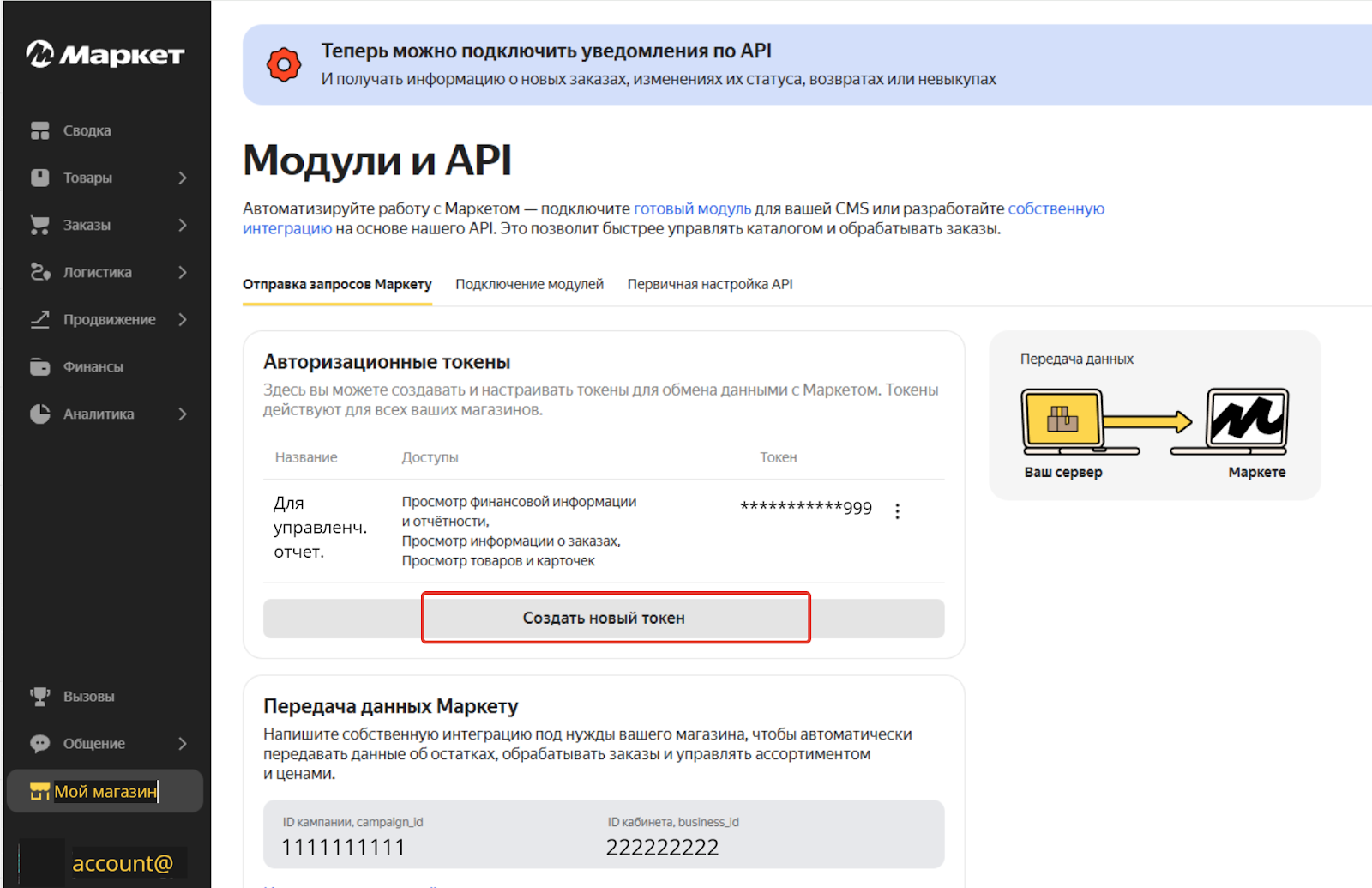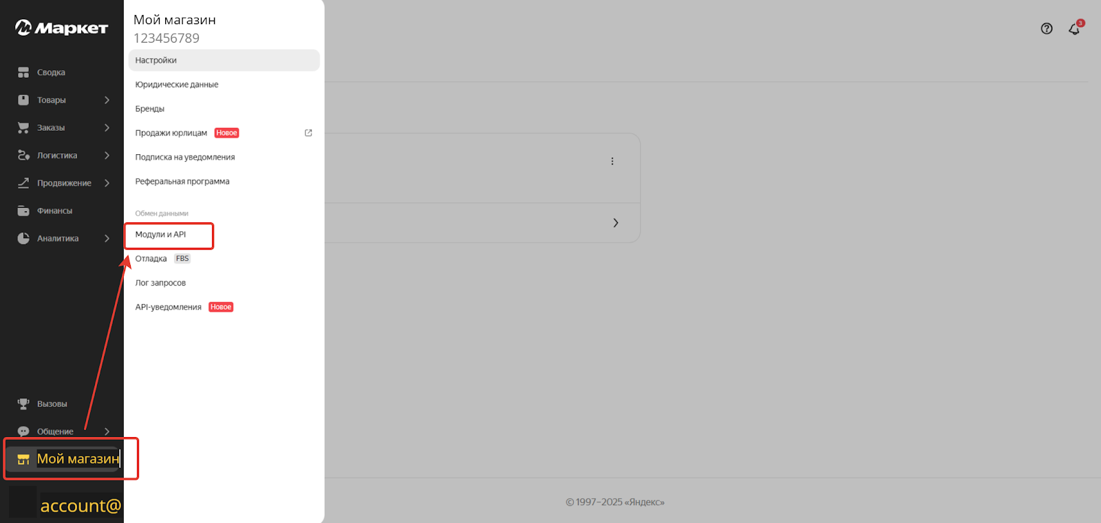 Шаг 1. В кабинете Яндекс Маркет в левом нижнем углу нажмите на название своего бизнеса и перейдите на страницу «Модули» и «API».