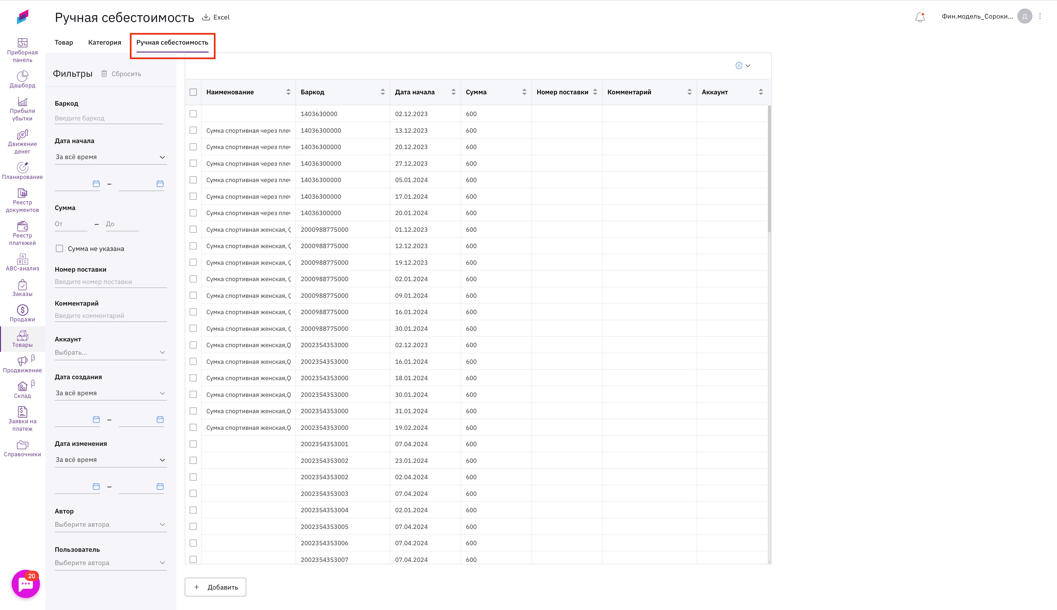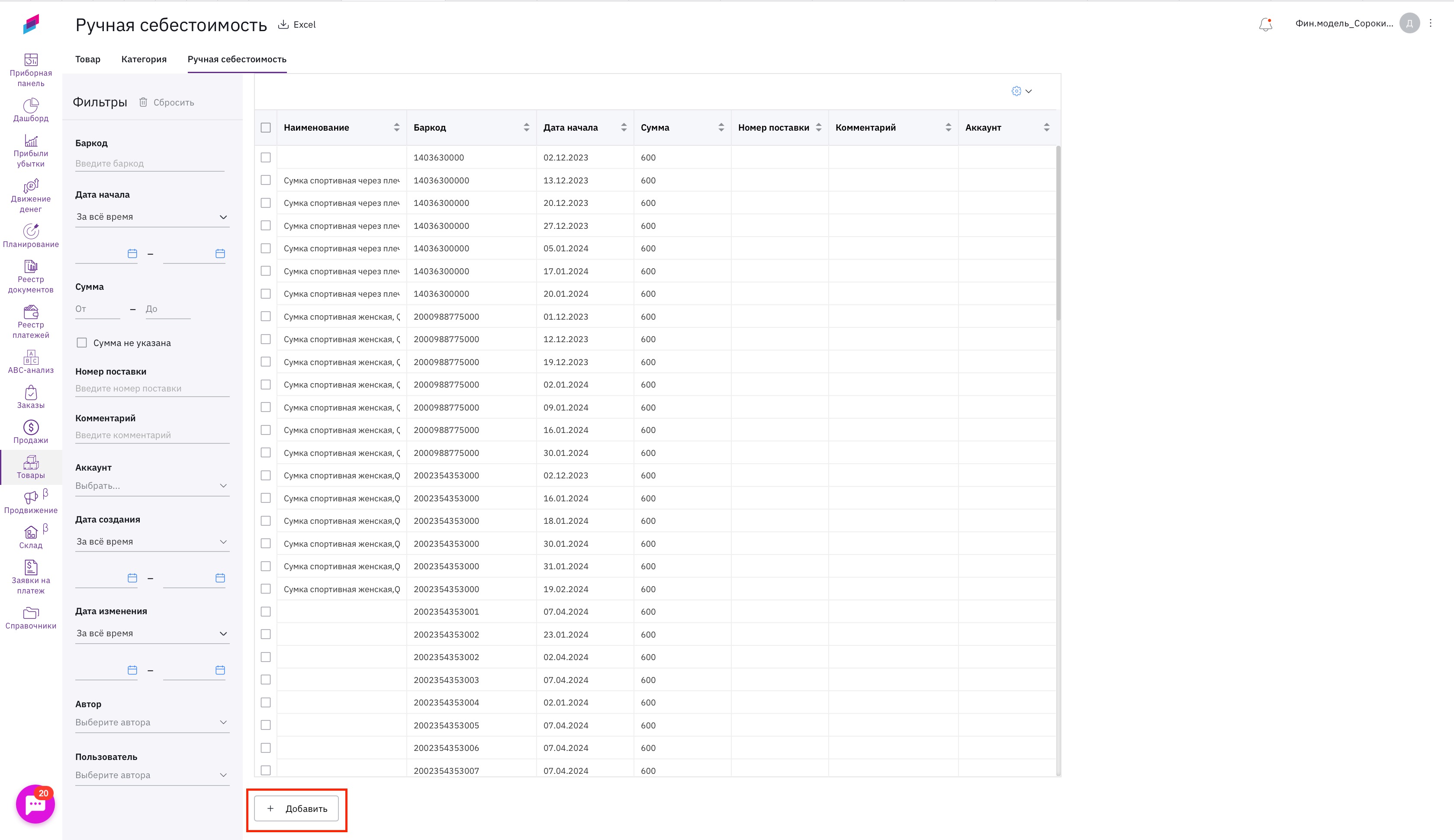 2. Если у вас уже есть сформированная себестоимость по баркодам в Excel, вам нужно скопировать оттуда три столбца (дата, баркод, сумма) и вставить в сервис через кнопку Добавить