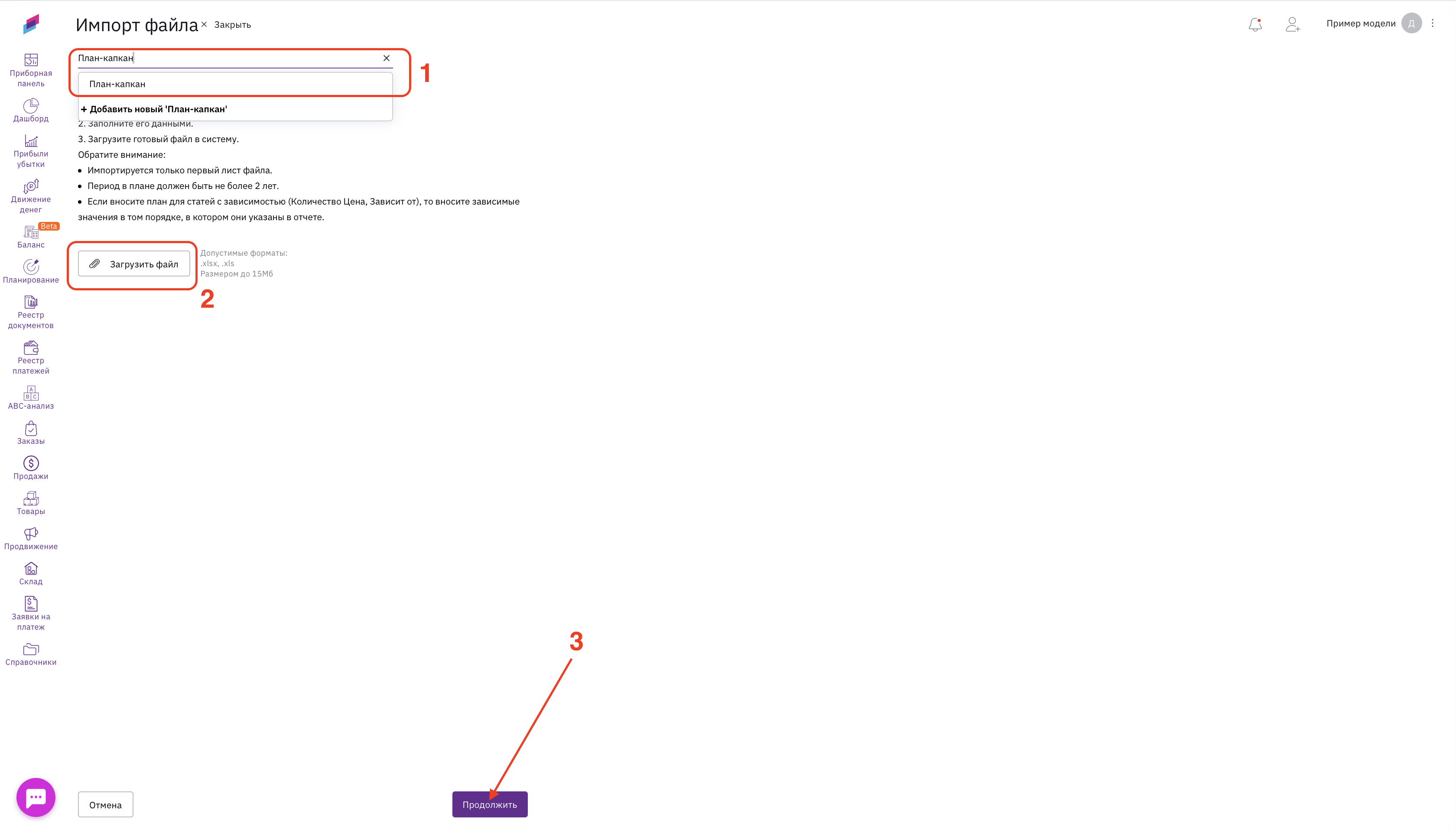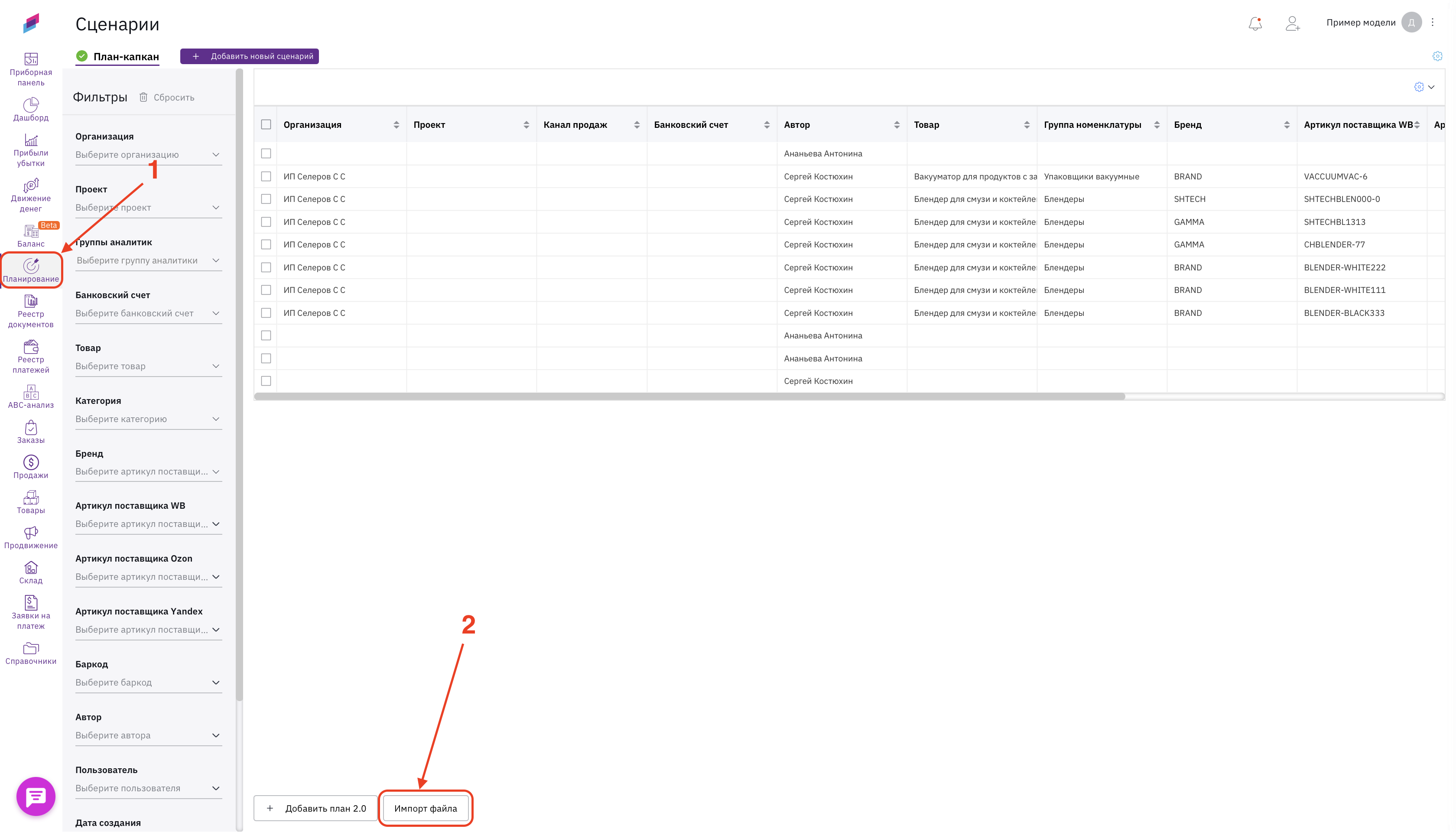 1. В разделе «Планирование» (1) нажмите кнопку «Импорт файла» (2).