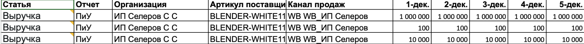 2️⃣ если статья в сервисе разбита на Цену и Количество (как правило, так разбита Выручка и Возвраты) - в шаблоне необходимо продублировать название статьи 3 раза.