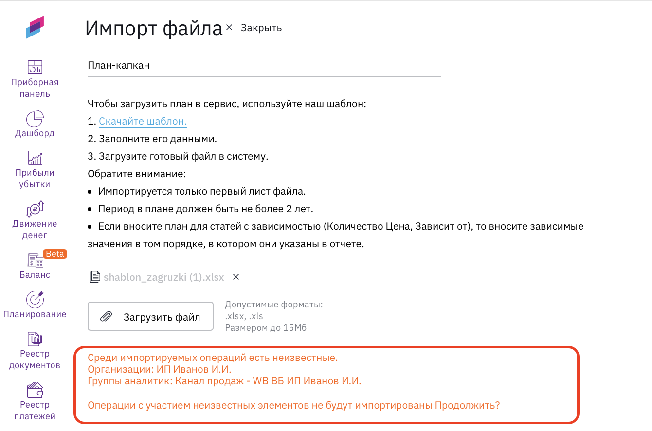 4. При успешном сохранении плана система вернет вас в окно "Планирование". Если импорт не пройдет, система выдаст ошибку с пометкой, что не так в файле