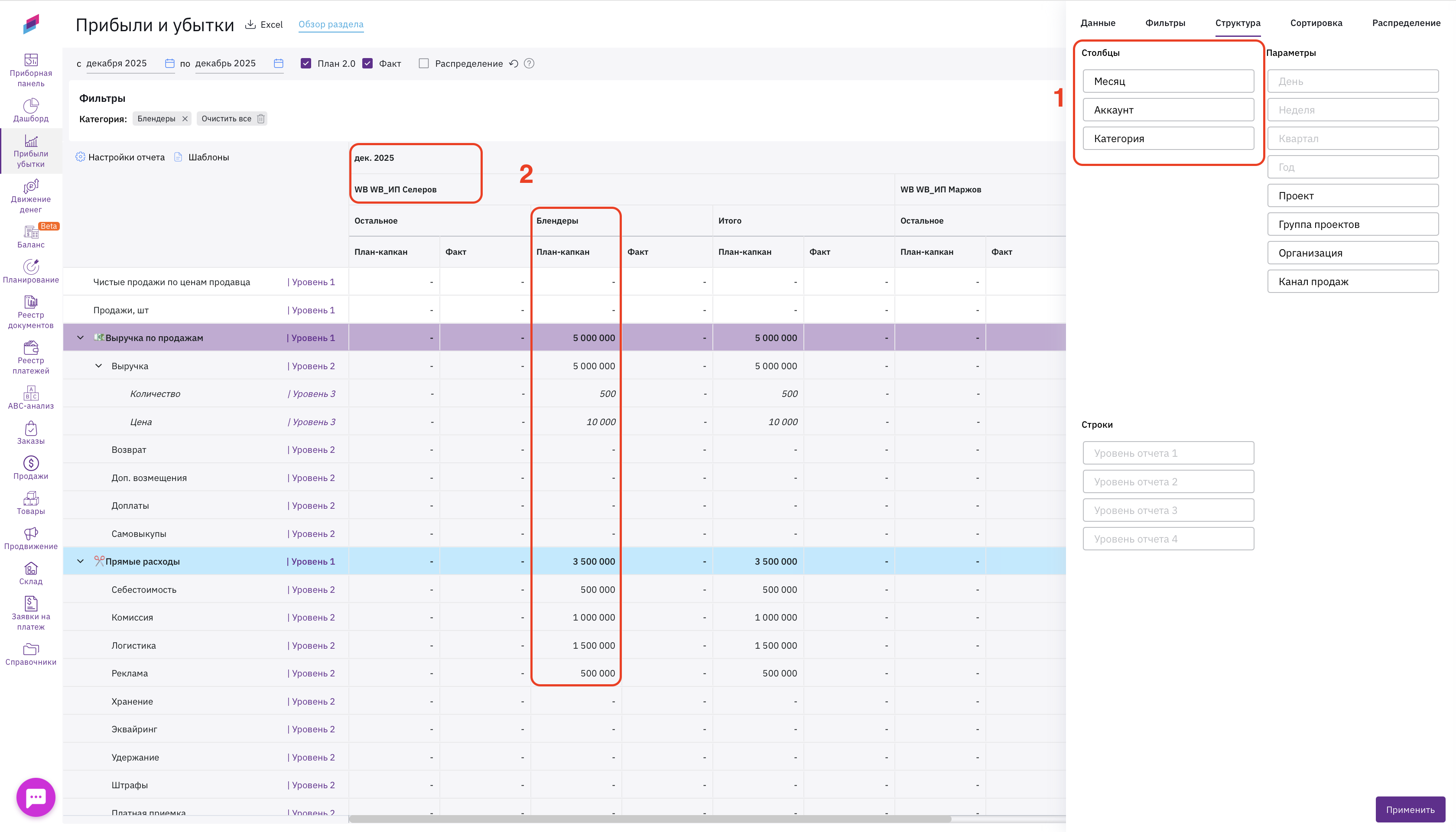 Для этого мы переходим в Отчет о прибылях и убытках и выстраиваем структуру отчета так, чтобы в столбцах у нас был Канал продаж, Категория, Организация (при необходимости).